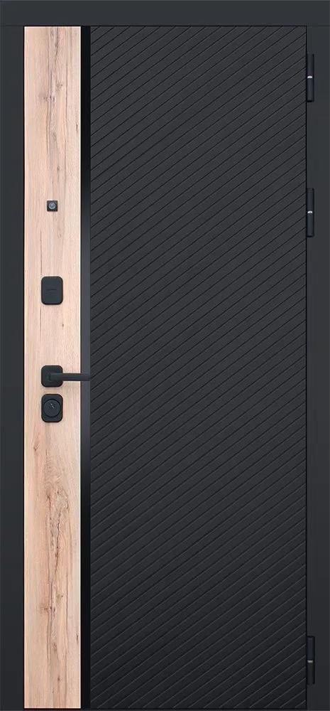 Порошковое покрытие “муар черный” Панель МДФ 10 мм. Объемная фрезеровка. Цветовая комбинация: “дуб галиф натур”, “шагрень черная”. Декоративная пластиковая вставка, цвет "черный". Наличник МДФ 80 мм., цвет “черный кварц”.