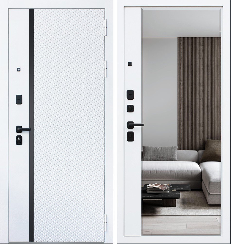 Порошковое покрытие "муар белый". Экошпонированная панель МДФ 10 мм (дизайн ФЛС). Цвет "белый матовый". Вертикальная вставка из черного глянцевого лакобеля. Объемная фрезеровка. Наличник гладкий, МДФ 80 мм.